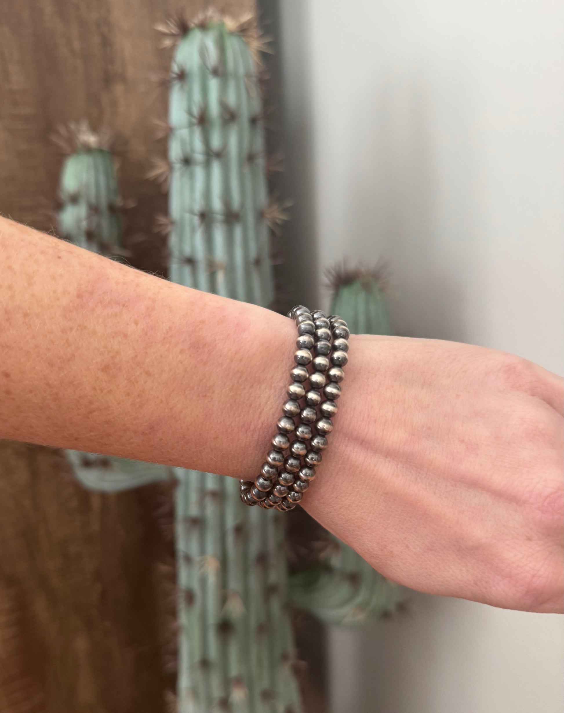 It's a little western, a little classic, and the perfect addition to your bracelet stack. Grab a few of the The Sterling Silver Round Bead Stretch Bracelets to build your own wrist stack or wear one solo for a hint of shine. Did we mention these pair perfectly with our handcrafted strands?! The bracelet features 5mm sterling silver round beads on elastic cord for easy, comfortable wear. Whether you’re dressing it up or keeping it simple for everyday errands, this piece brings a timeless western-inspired edge to any outfit.
