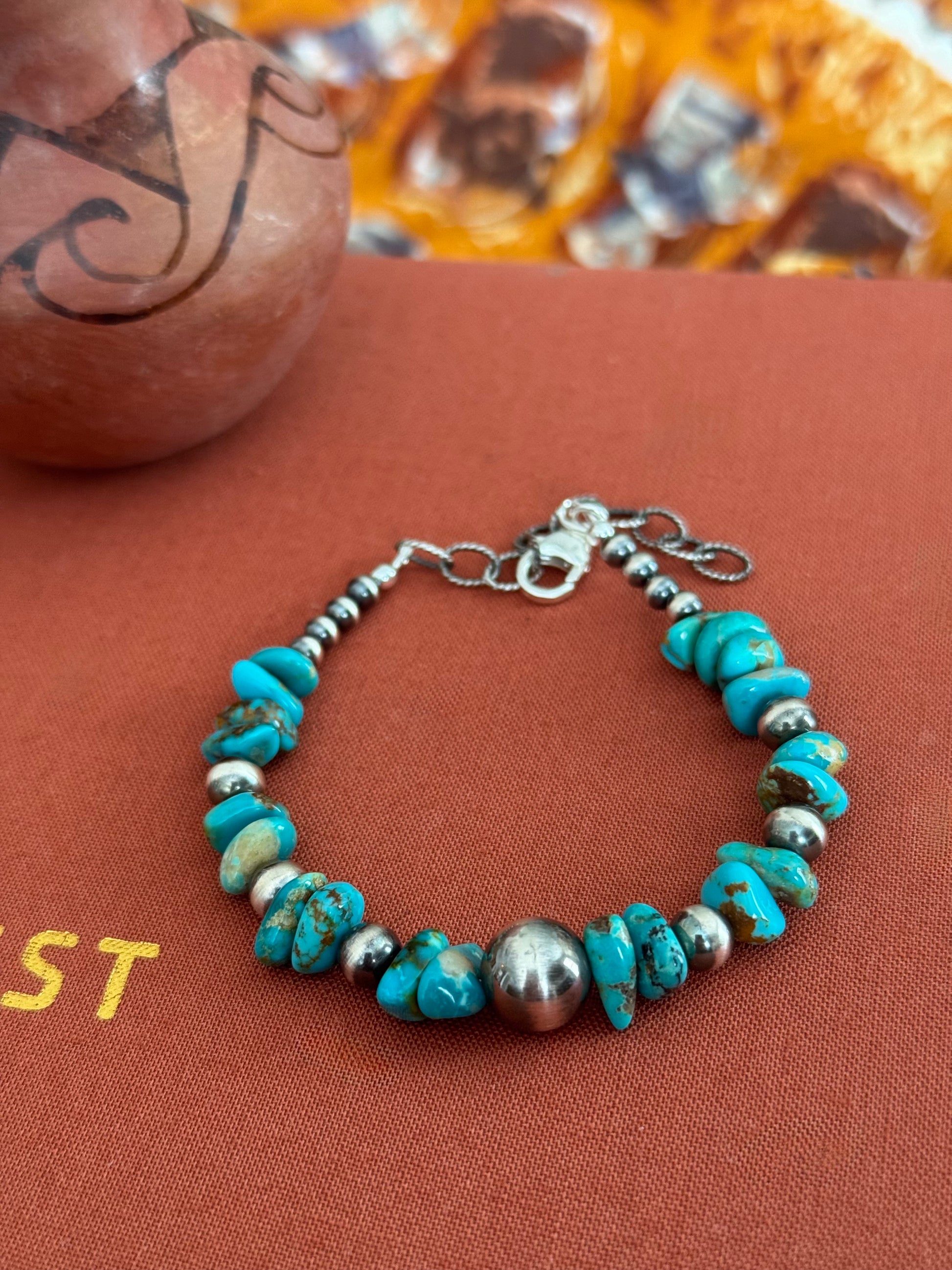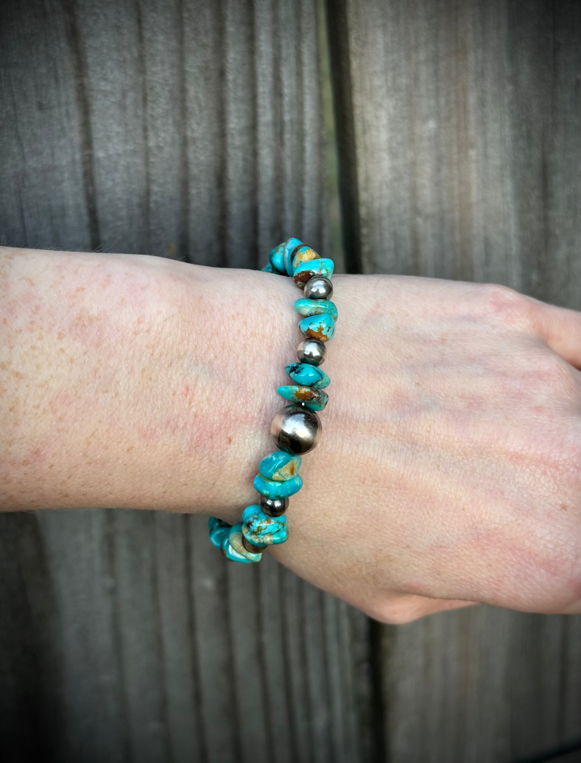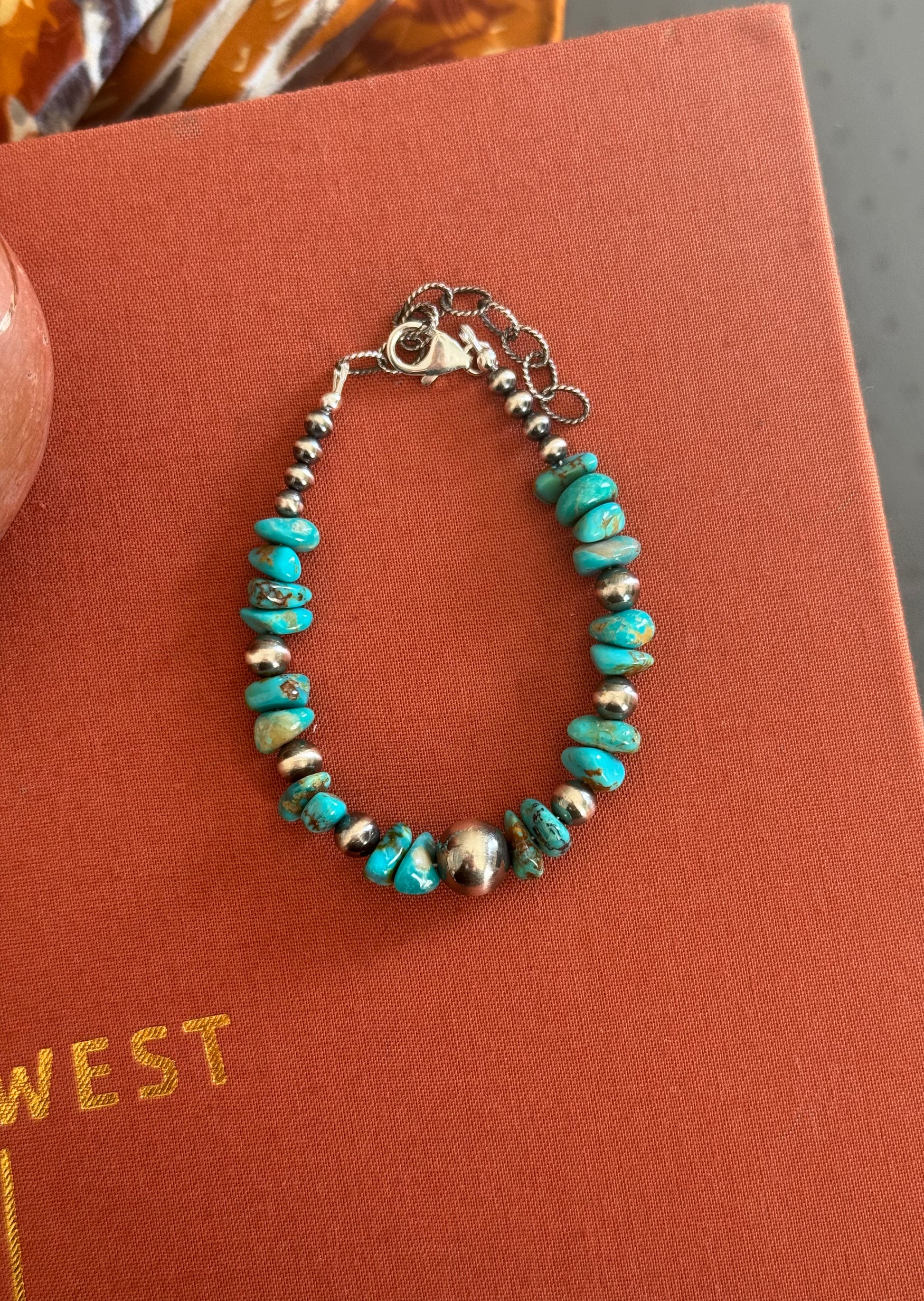 The Bozeman Bracelet is pure arm candy. It is bold, bright, and beautifully balanced. Featuring mostly Mine #8 turquoise beads and 6mm sterling silver pearls, it also has a 10mm focal bead that really grabs the eye. The turquoise pops with its signature matrix and vibrant tone, while the silver adds the perfect shine. This is the kind of piece that turns a stack into a statement! (PLUS, it matches The Over the Branch Strand and The Ponderosa Strand)