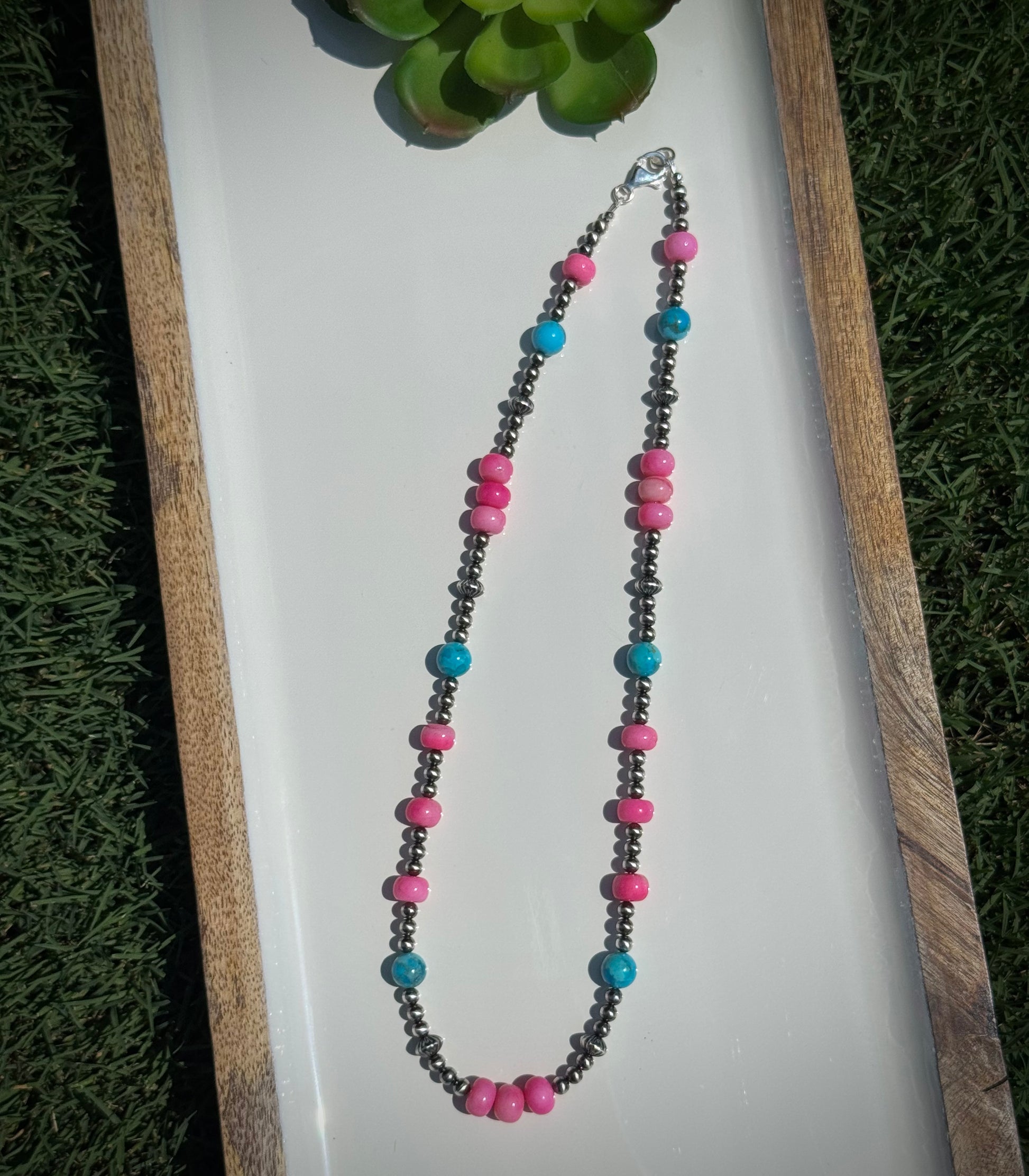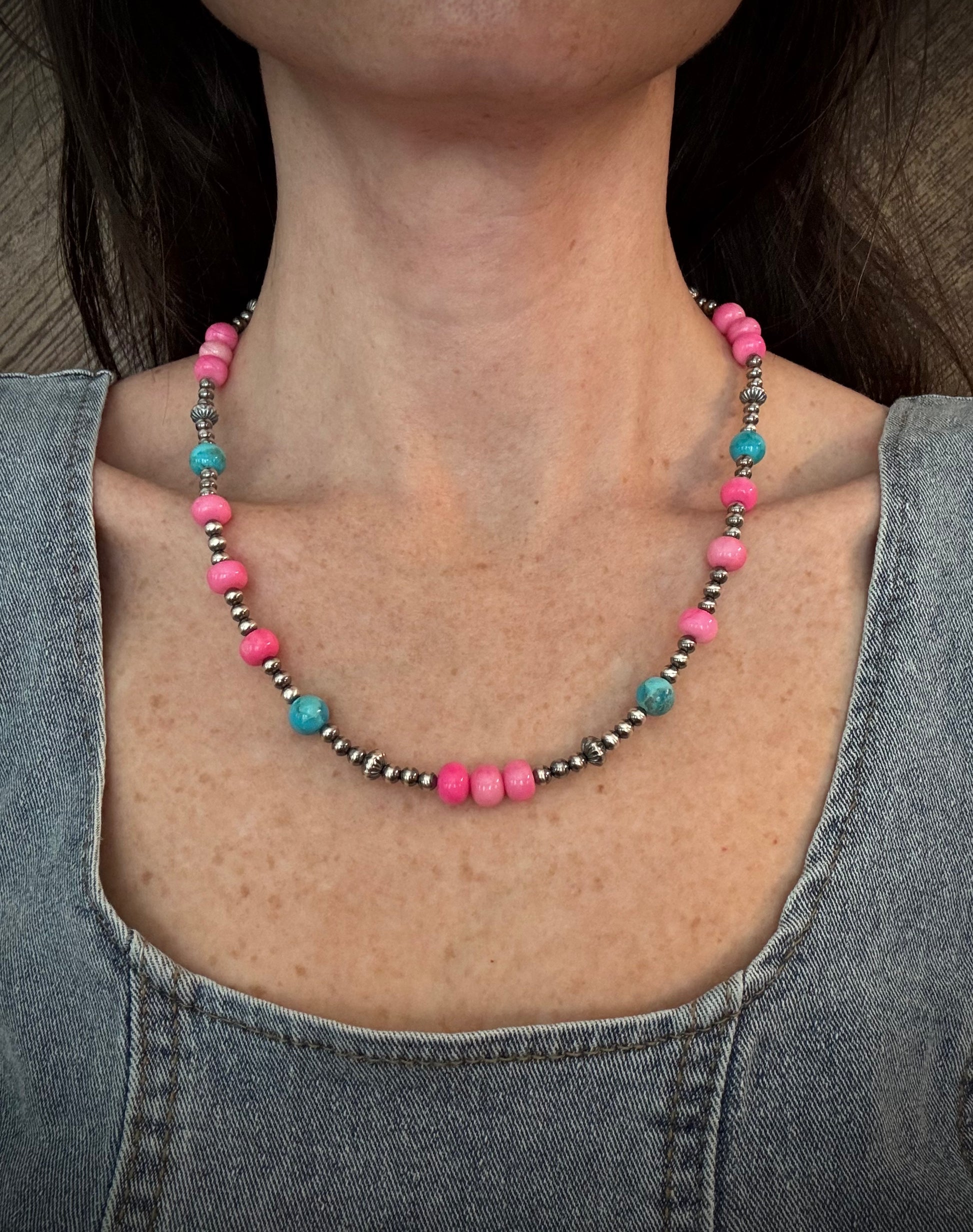 Bright, bold, and just perfect - The Candy May 2.0 Strand is the little sister to The Candy May Strand. The strand features 8-9mm dyed pink opal beads, genuine Kingman Turquoise from Arizona, and a mix of sterling silver round and corrugated saucer beads for texture and shine. This strand is sweet, beautiful, and holds a big place in my heart.