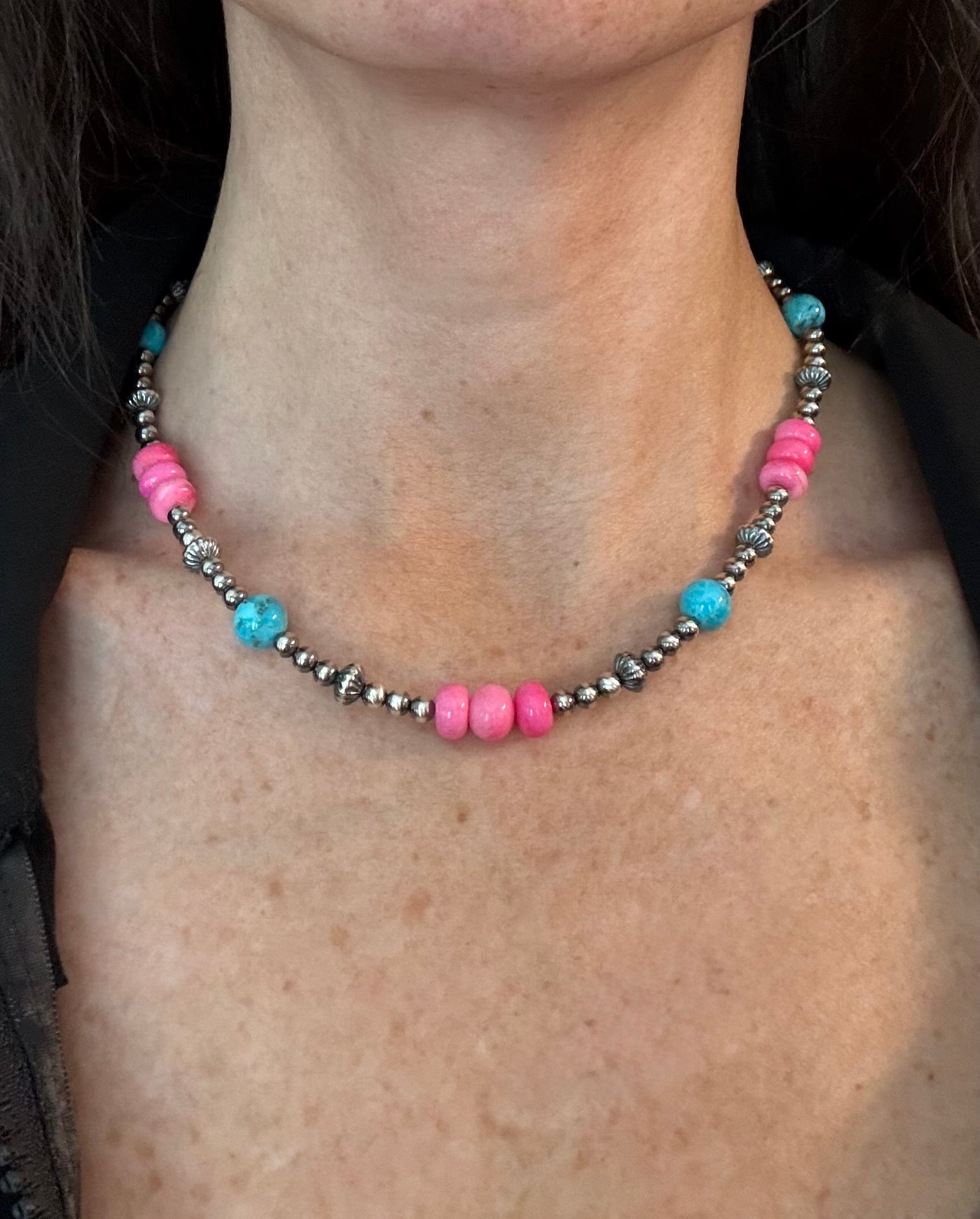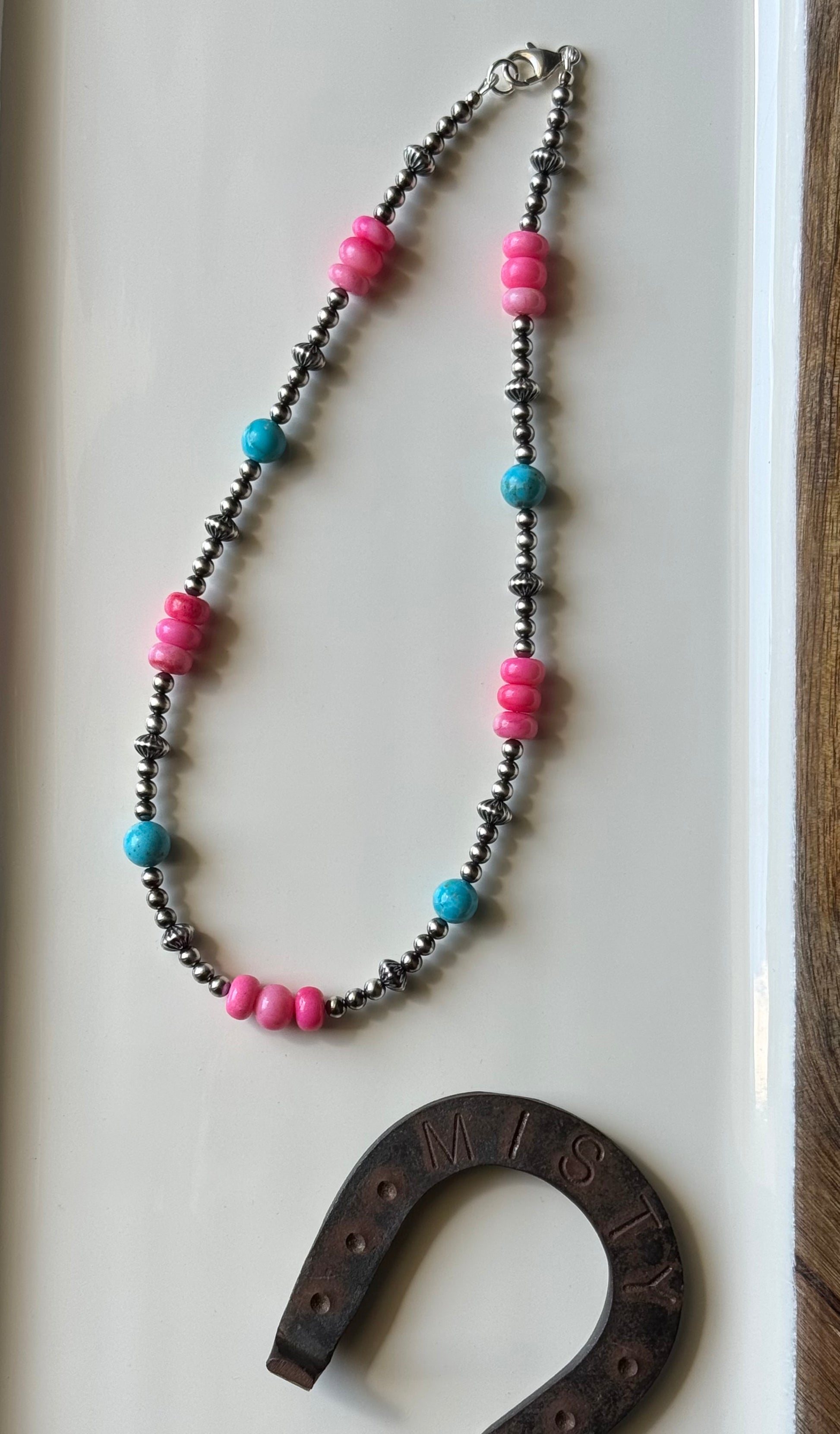 Bright, bold, and just perfect - The Candy May 3.0 Strand is the little sister to The Candy May & The Candy May 2.0 strands. The strand features 8-9mm dyed pink opal beads, genuine Kingman Turquoise from Arizona, and a mix of sterling silver round and corrugated saucer beads for texture and shine. This strand is sweet, beautiful, and made for YOU!