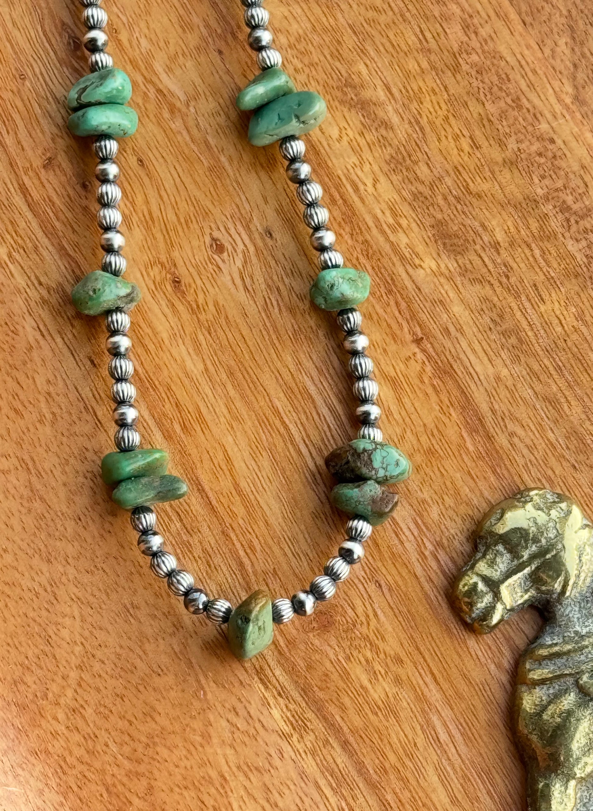 The Carico Cactus Strand celebrates the rare beauty of Carico Lake turquoise in all its earthy, green, and brown glory. Paired with 4mm round and 4mm corrugated sterling silver pearl beads, this strand brings texture, color, and personality to any stack. It’s wearable and versatile but still distinct - the kind of strand that quietly stands out. A true must-have for any turquoise lover.