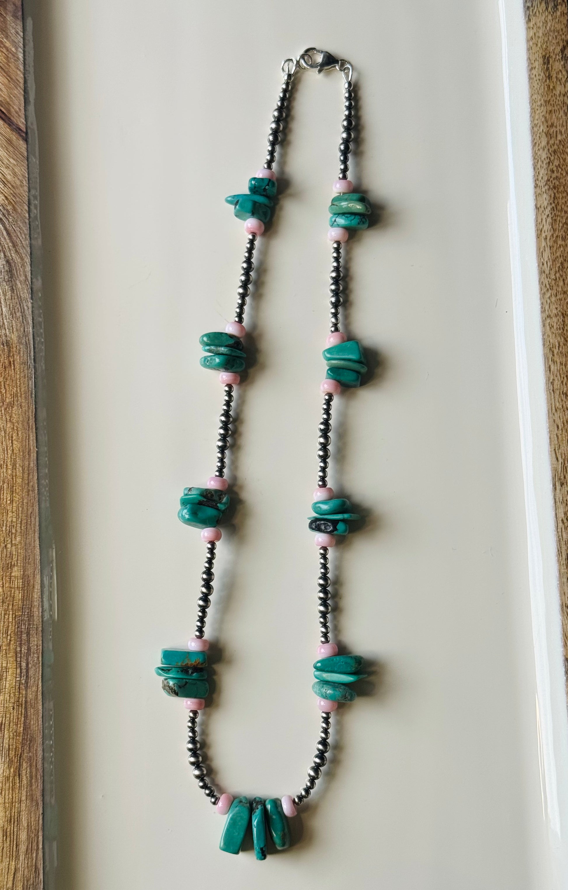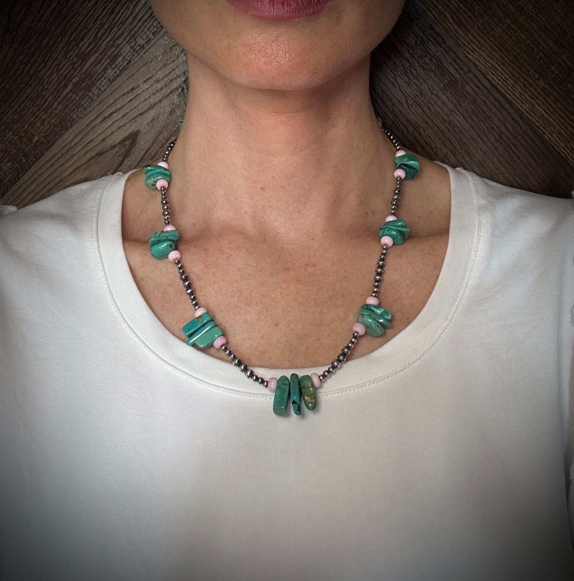 Bright, bold, and full of personality - the Chickadee Strand is the definition of cool-girl western. Genuine turquoise chips meet soft pink conch shell beads for a vibrant contrast that instantly lifts any outfit. Accented with 3mm & 4mm smooth sterling silver pearl beads, it’s a strand that brings a little sunshine and a lot of style. Playful yet timeless, this one’s bound to turn heads.
