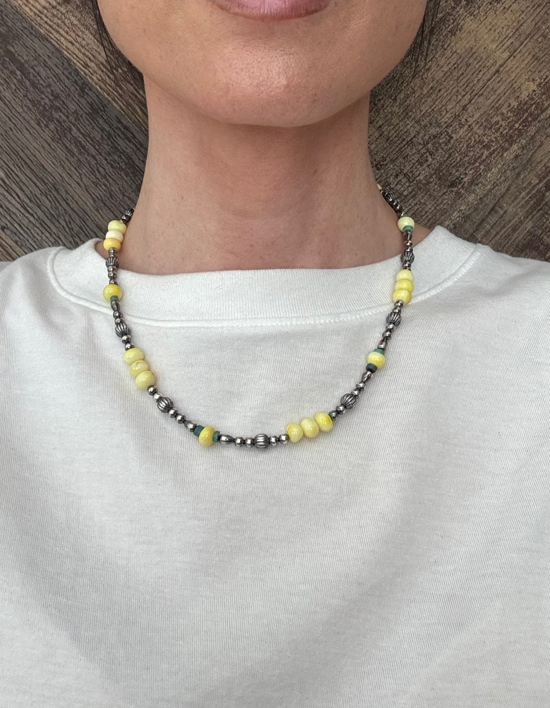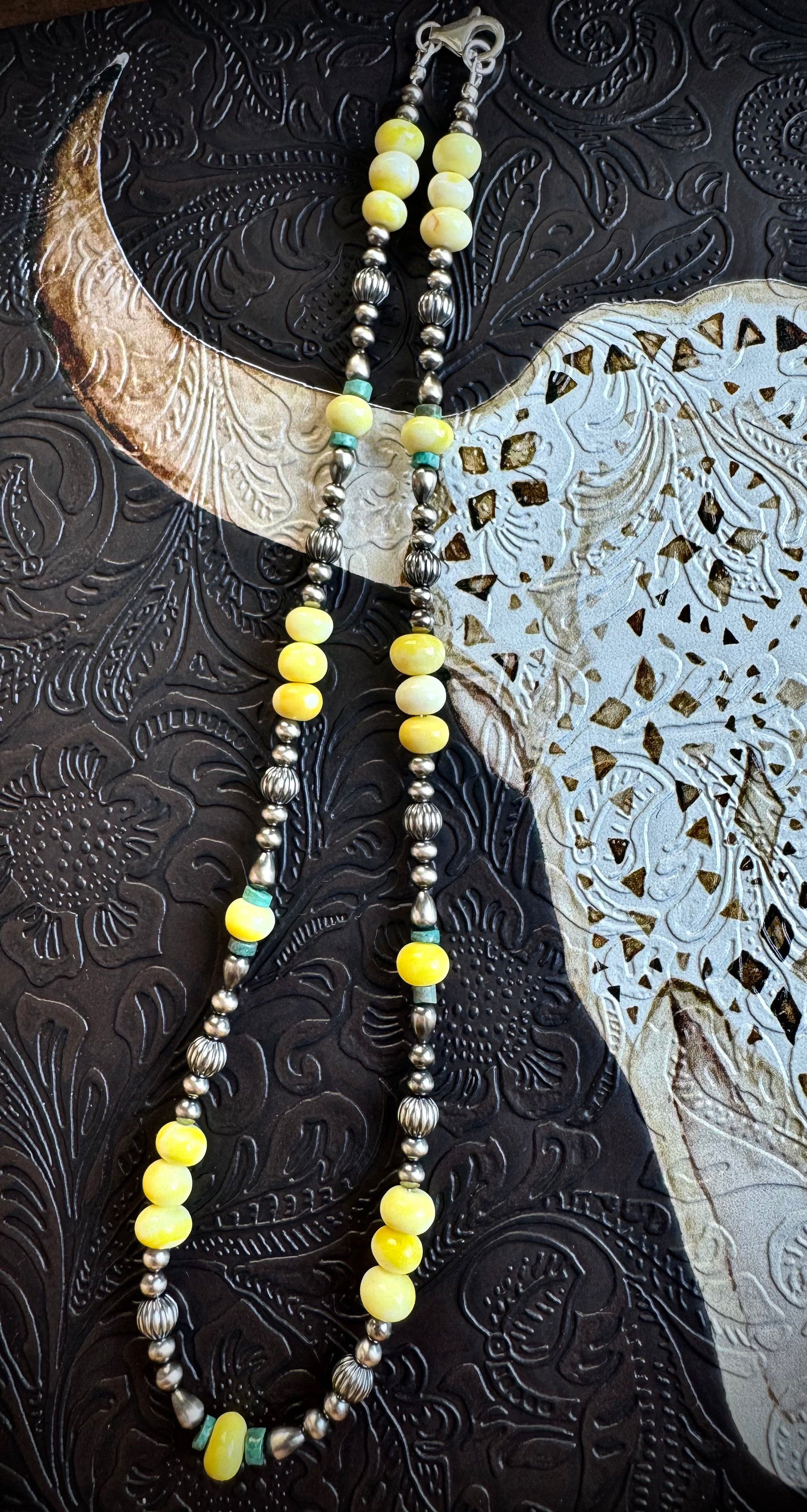 Bright, sunny and just different enough, The High Noon Strand is made with snappy butter-yellow opal beads (hand-cut, hand-drilled, and dyed) accented with small turquoise heishi beads. The strand also features an elegant array of sterling silver teardrop-shaped beads, smooth round beads (4mm), and corrugated round beads (6mm). It's a playful and unique pop of color in your necklace stack. Definitely not basic.