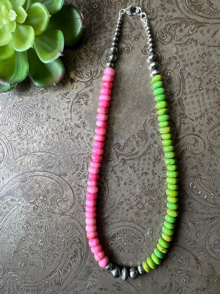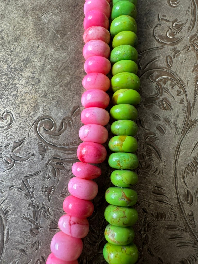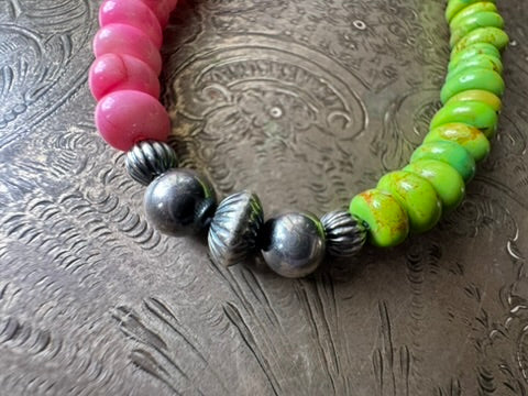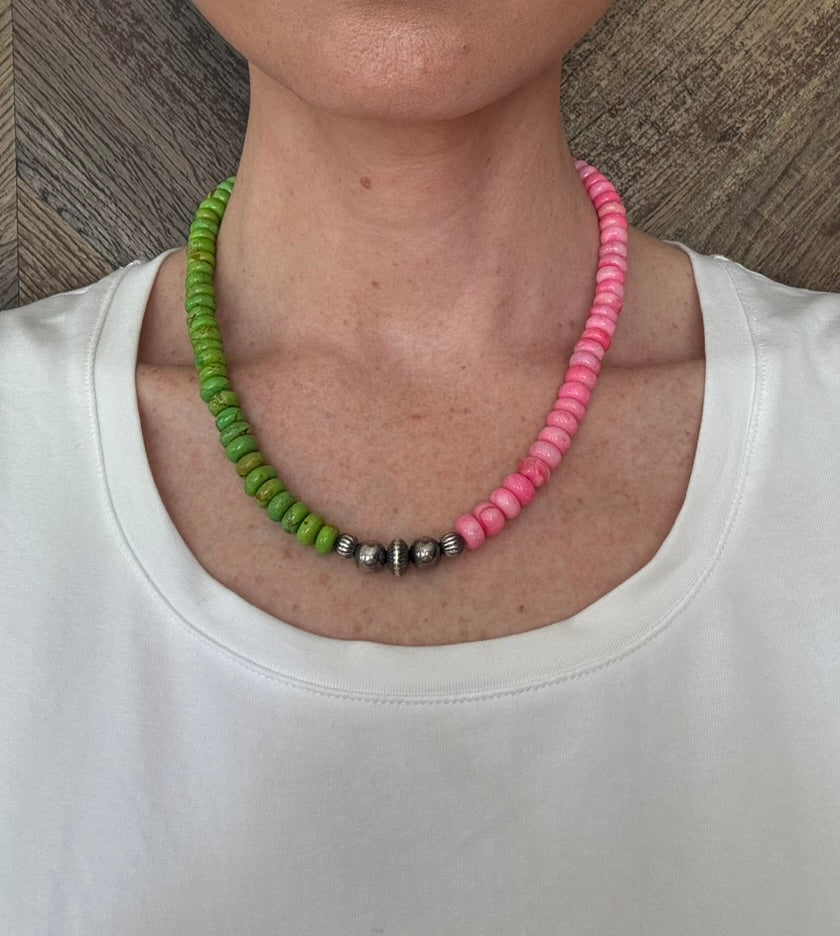 This strand does all the talking. With one side hand-strung in natural dyed pink opal and the other in Mohave Green beads from the Kingman Mine, it’s a two-tone mix that feels unexpected but just right. Finished with a mix of round, corrugated, and saucer sterling silver beads, The Miss Mohave Strand is bold and very, very cool!