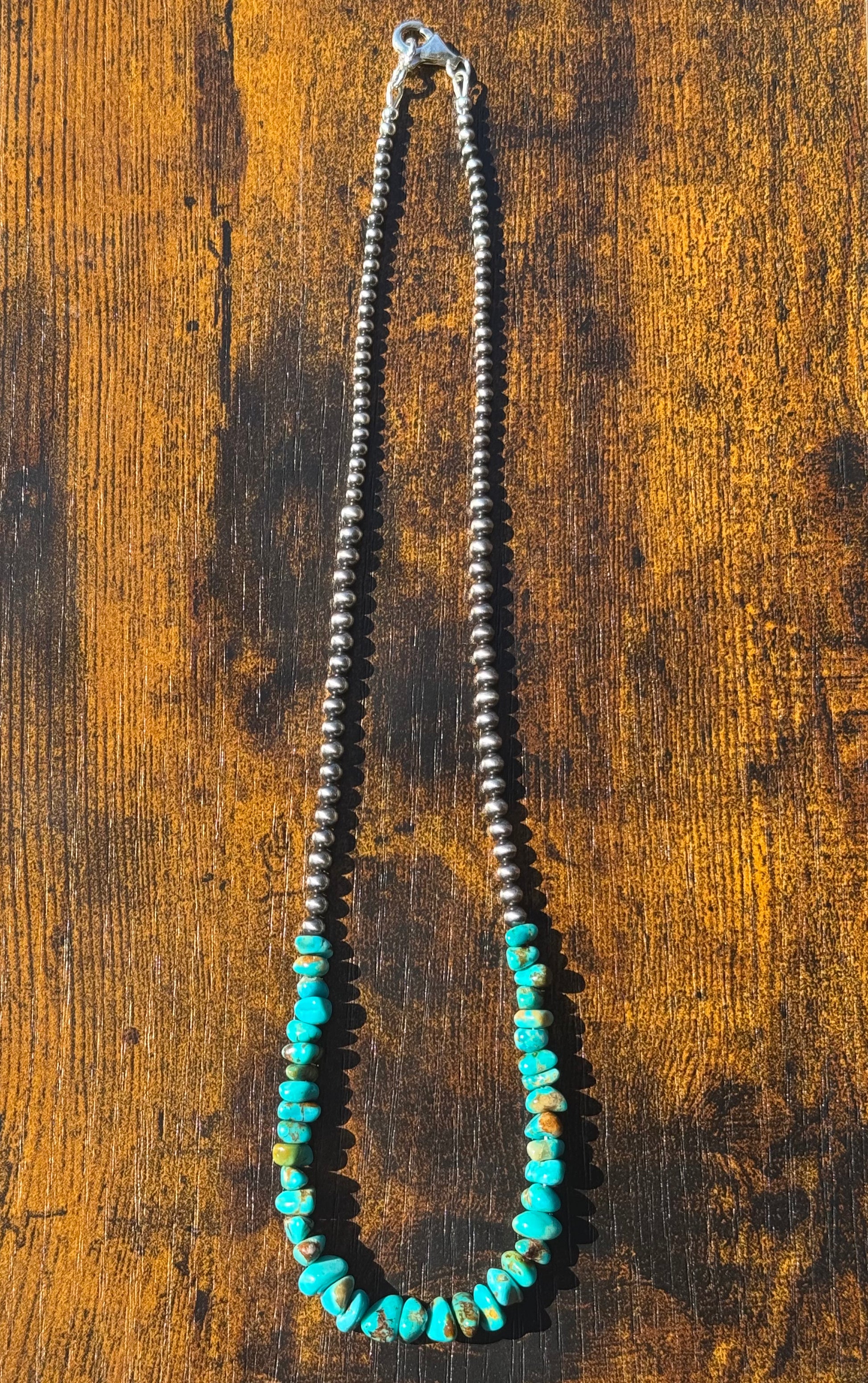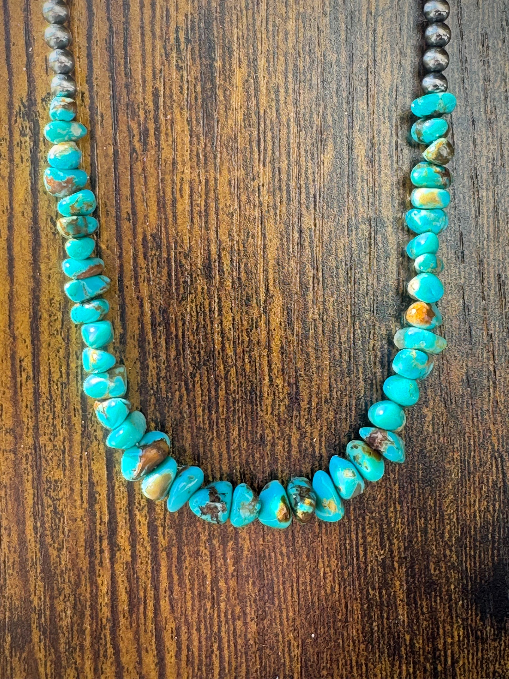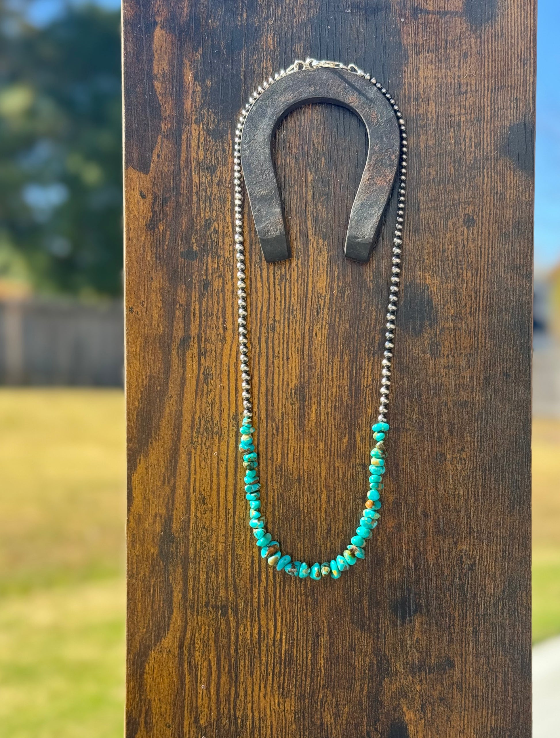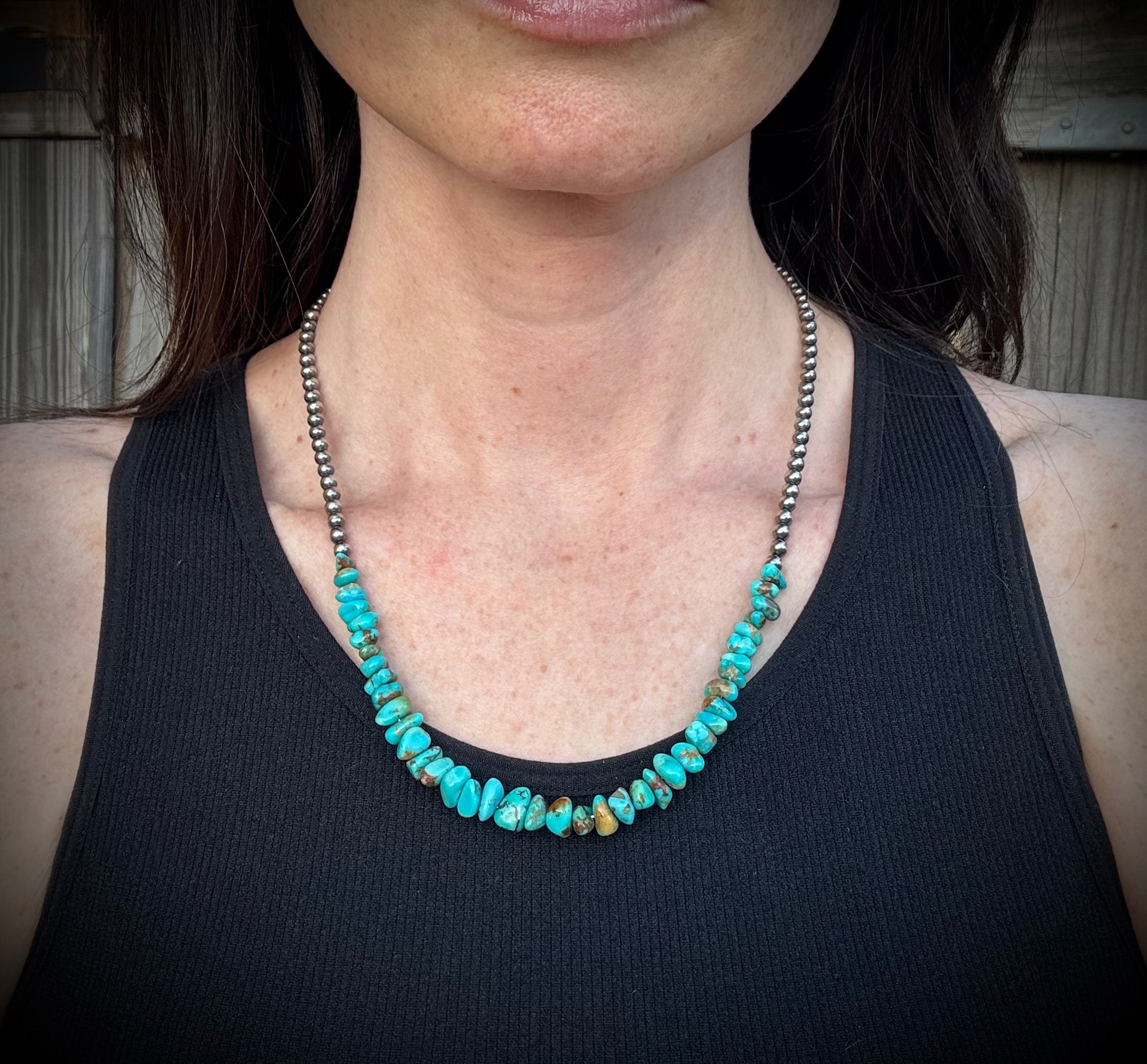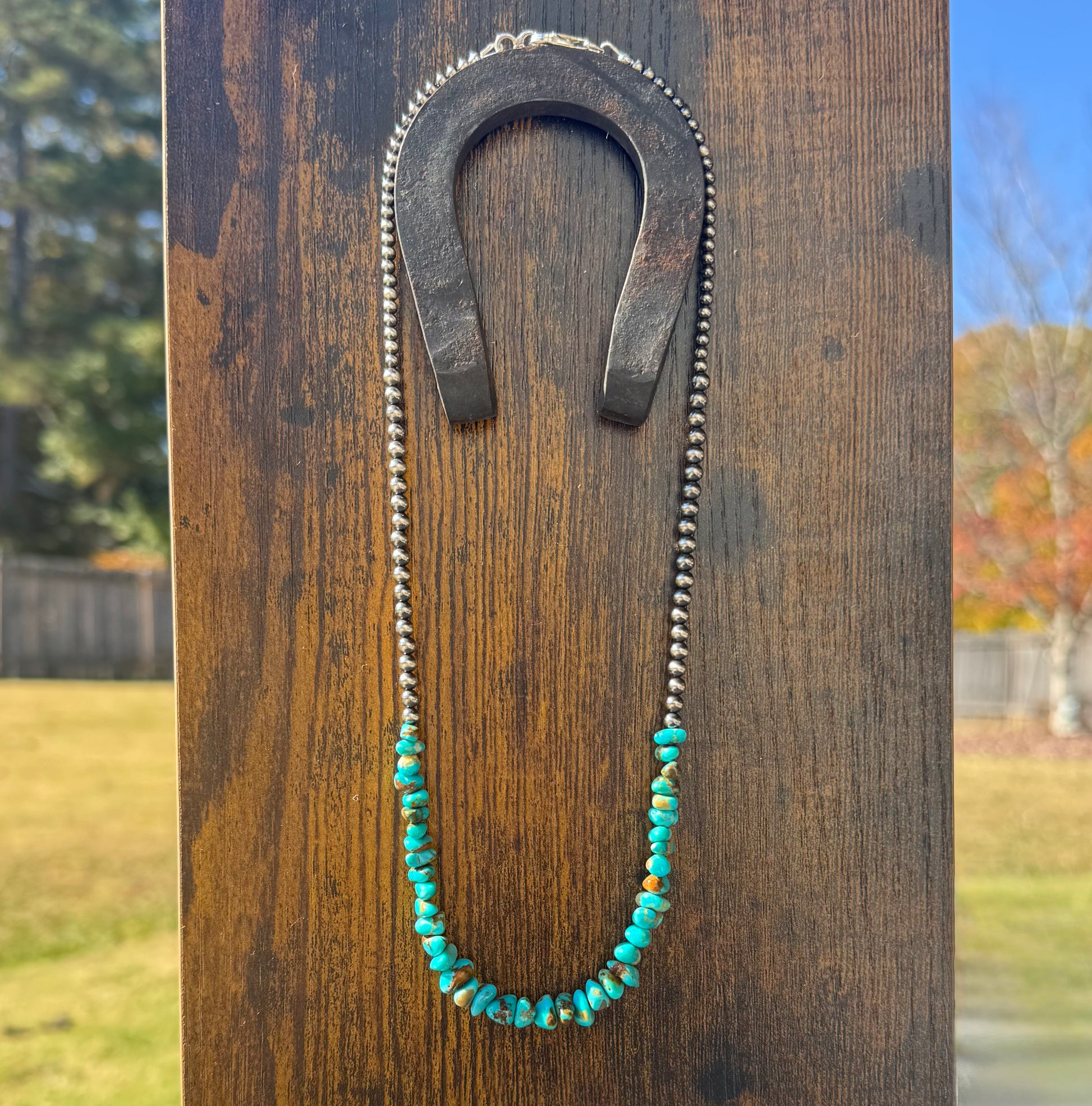 The Over the Branch Strand brings together slightly graduated Mine #8 turquoise beads with 3mm and 4mm sterling silver pearl beads for that timeless southwestern look. Each turquoise bead shows off its own rich color and unique matrix. It’s an easy-wear piece that still feels special, laid-back but effortlessly cool. A perfect strand for everyday wear or layering into your stack.