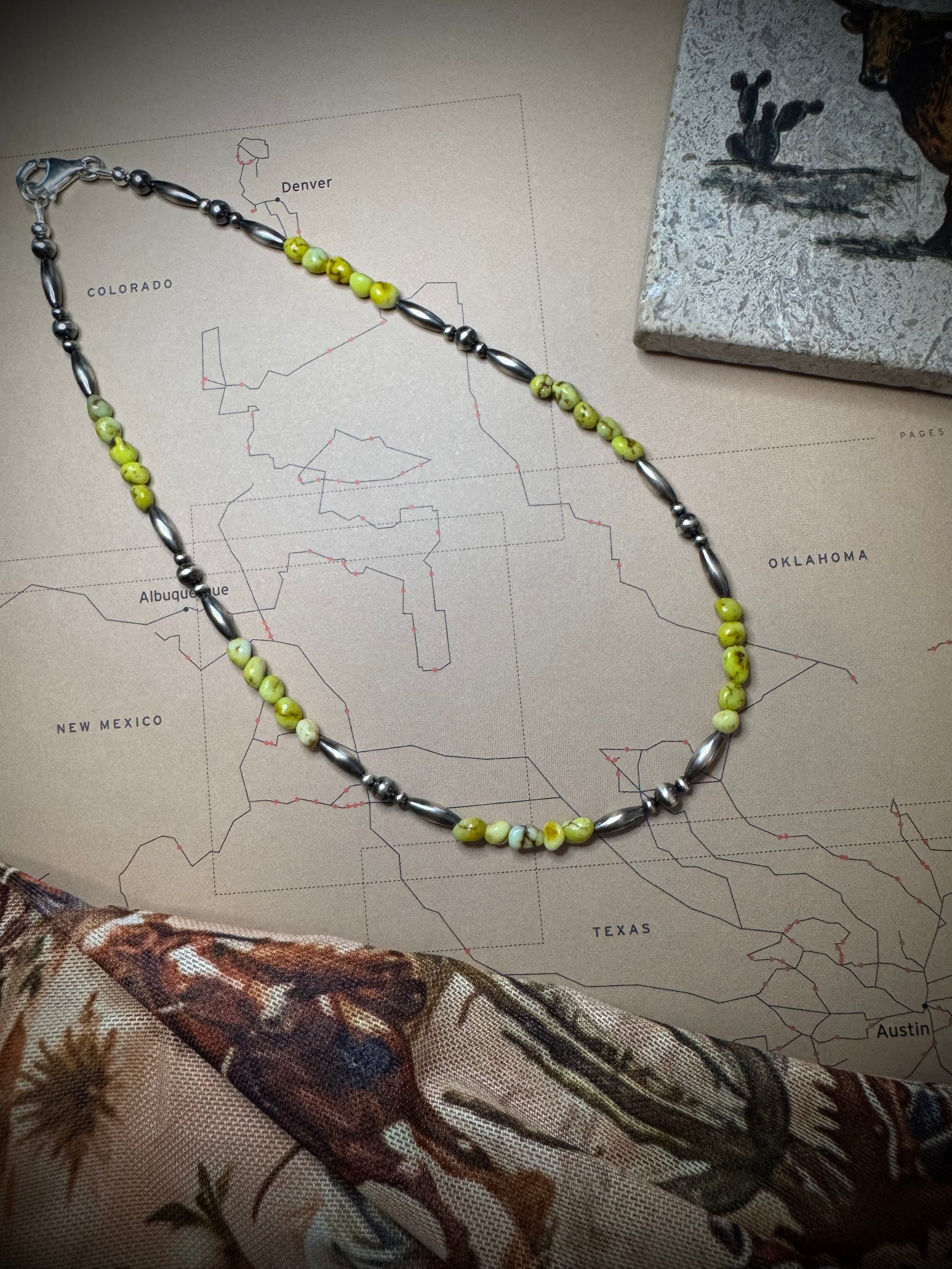 Delicate, striking, and probably your new favorite layering piece. The Palomino Pistol Strand is made with 4mm rounded nugget beads of Palomino variscite, a rare and soft colored stone. The gorgeous stones are paired with sterling silver torpedo beads and small sterling silver round beads for just the right amount of shine. The Palomino Pistol Strand is a shorter strand draping higher around the neck making it the perfect stacking strand.