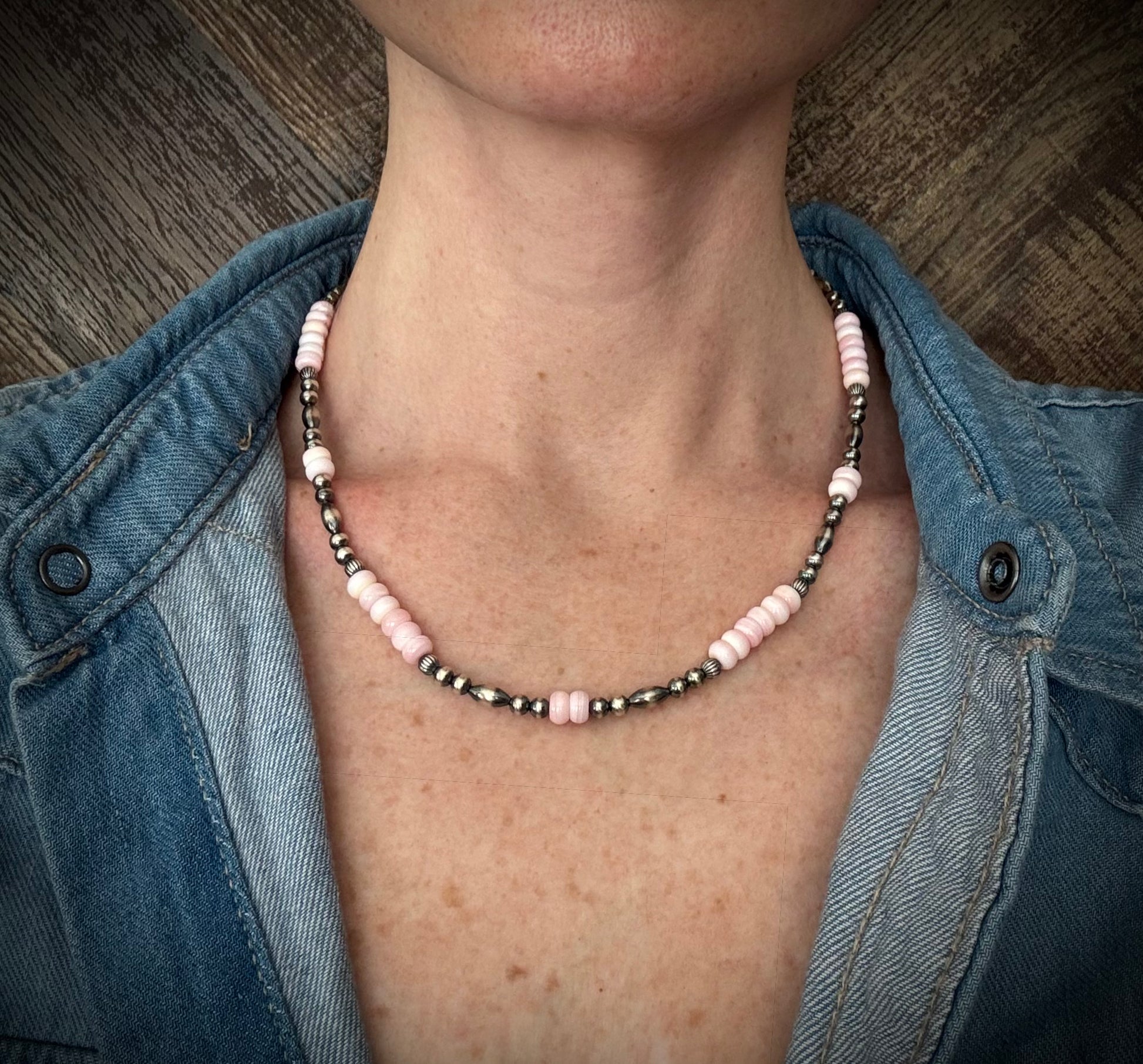 The Prairie Blossom Strand is a delicate strand that combines perfectly rosy pink conch shell 6mm rondelle beads with 4mm sterling silver round, 4mm corrugated round, and 4x8mm torpedo-shaped beads. This strand has texture, flow and femininity making it pretty without being too loud. The Prairie Blossom Strand makes simple feel very special!