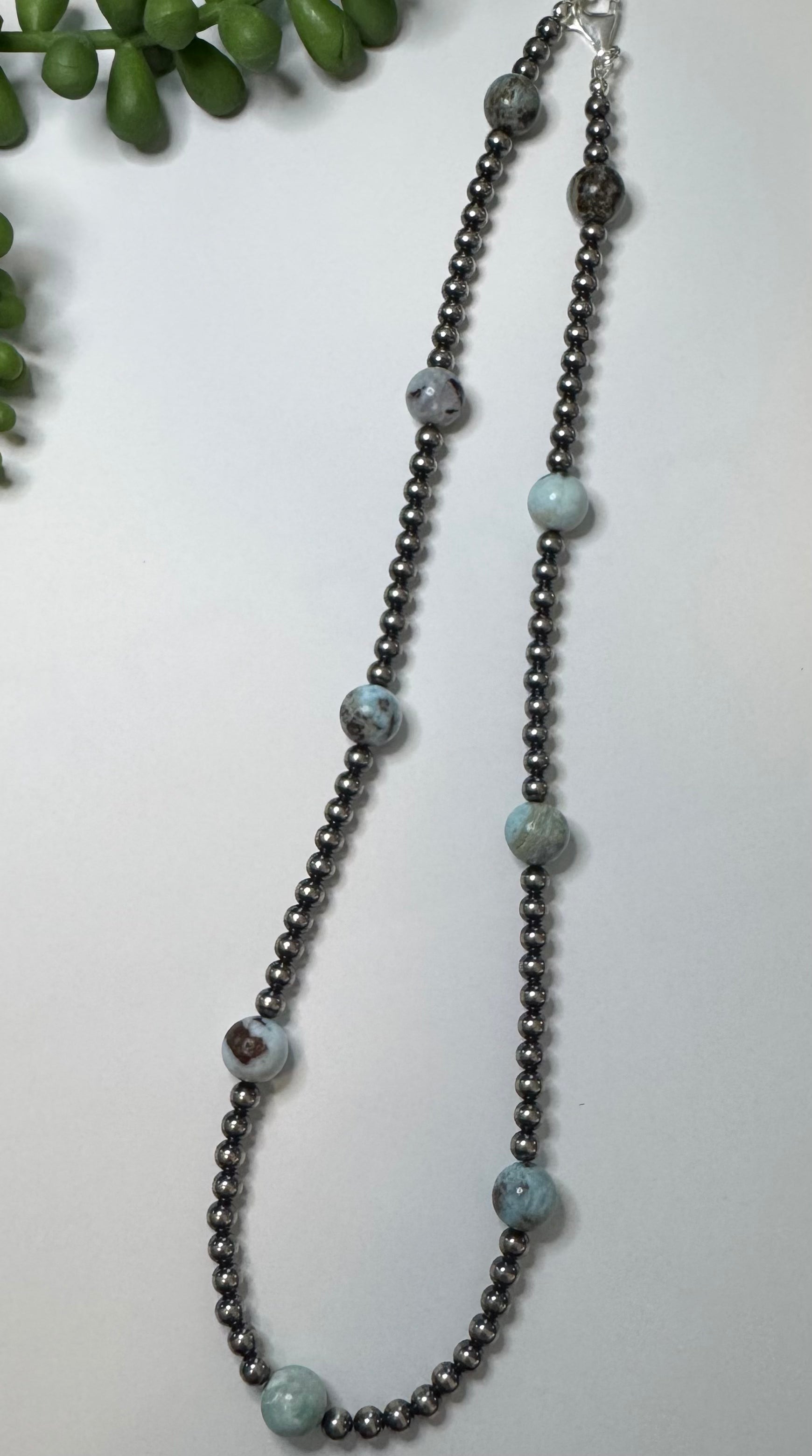 Like open skies over wide plains - The Prairie Sky Strand is calm, serene, and quietly beautiful. Featuring 8-9mm round larimar beads in a soft, pastel blue with hints of earthy brown matrix, it is accented with 4mm sterling silver round beads. It’s gentle in color but strong in presence.