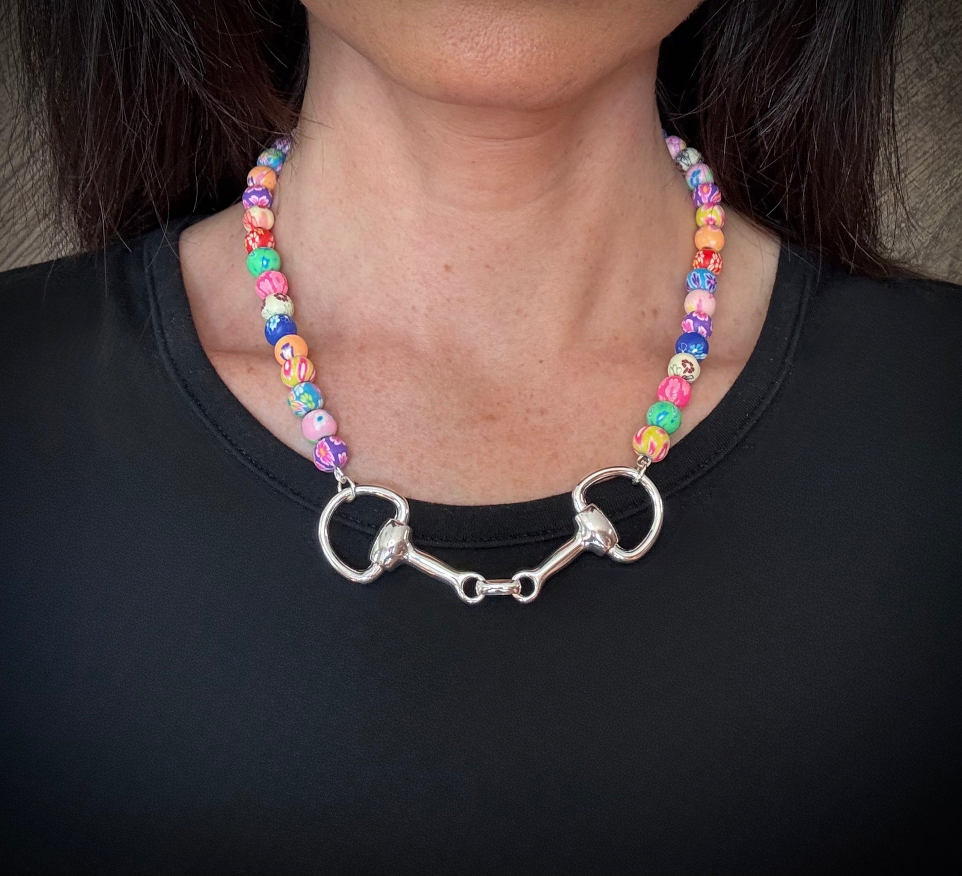 The Rainbow Rider Strand is pure statement energy. It is bold, bright, and full of fun. Clay beads in every color of the rainbow bring a playful, one-of-a-kind vibe, while the shiny silver-plated "pewter" (zinc-based alloy) snaffle bit focal adds a touch of western edge. Perfect for dopamine dressing, this strand turns any outfit into a conversation starter and somehow manages to match everything! This is a piece that doesn’t just accessorize. It truly owns the entire look!