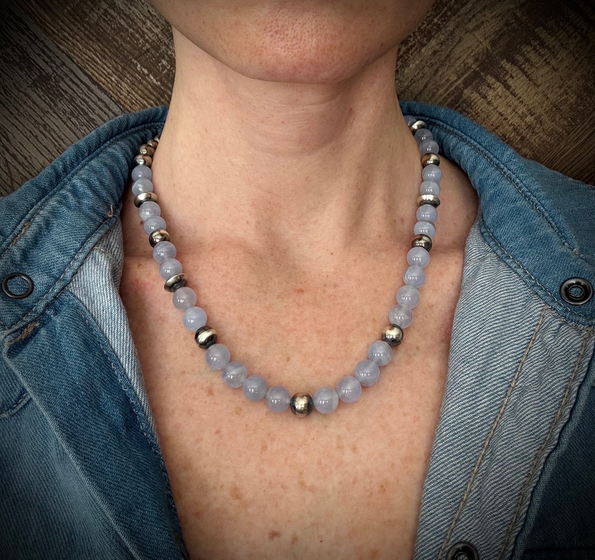 Drift into a dreamscape with The Smoky Dream Strand. Featuring AAA-grade natural Blue Chalcedony beads paired with gleaming sterling silver round and sterling silver saucers beads, this strand feels light, airy, and a little otherworldly. The soft, misty blue of the stones is both calming and dreamlike, giving this piece an ethereal glow that pairs beautifully with everything from denim to white linen. It’s the kind of necklace that doesn’t just accessorize, it sets a mood.