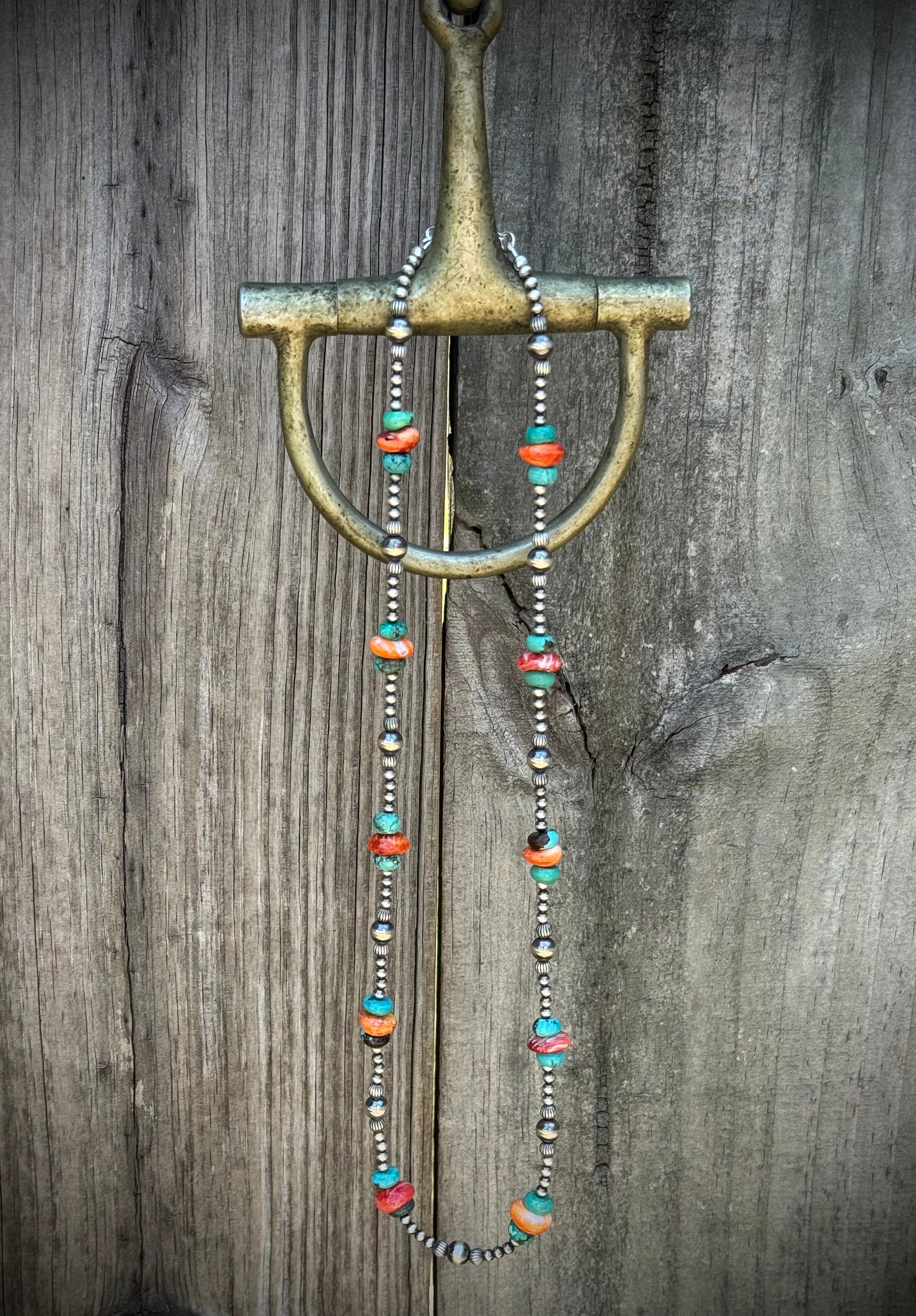 This one is a stunner, y'all! The Tequila Sunrise Strand is made with approx. 10mm Mexican orange/red spiny oyster shell irregular rondelle beads framed with greenish-blue genuine Hubei turquoise 6-7mm irregular rondelle beads. They're the perfect pairing. The strand also boasts sterling silver round and corrugated round beads from 3mm to 6mm. It's golden hour in strand form-served with a twist of turquoise.