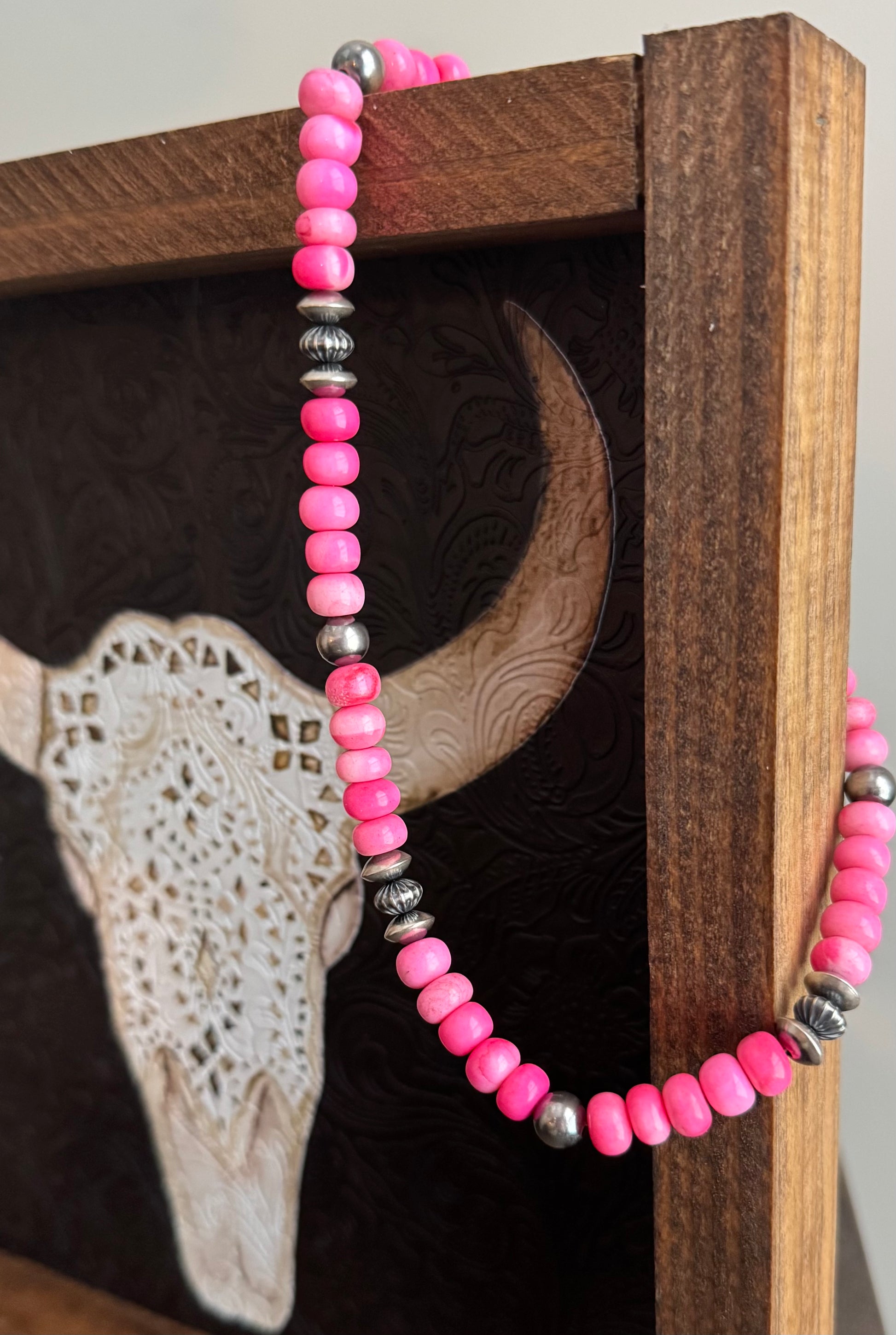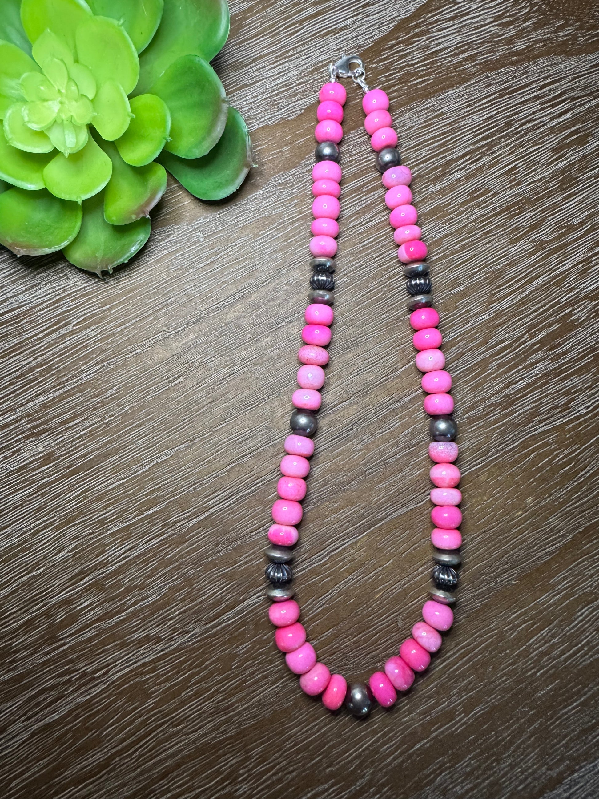 The Wild Spur Strand knows how to turn heads. Hand-cut and hand-drilled, these dyed pink natural opal 8-9.5mm rondelle beads will bring some playful energy to your stack. Scattered sterling silver saucer beads and 8mm sterling silver round beads add texture and spice to this strand. If you are a little wild, a little sweet and like to forge your own trail, this is the necklace you've been waiting for.