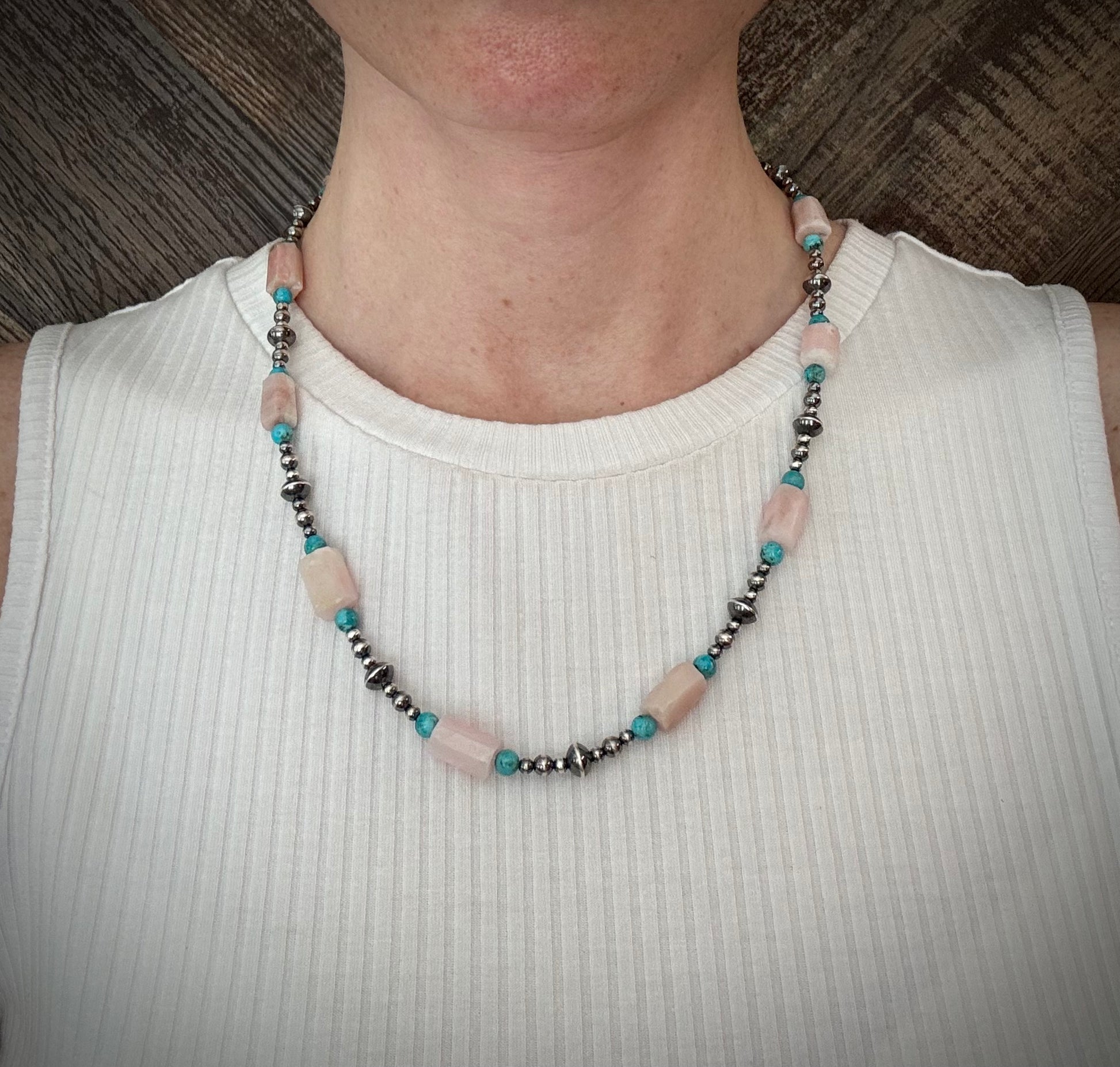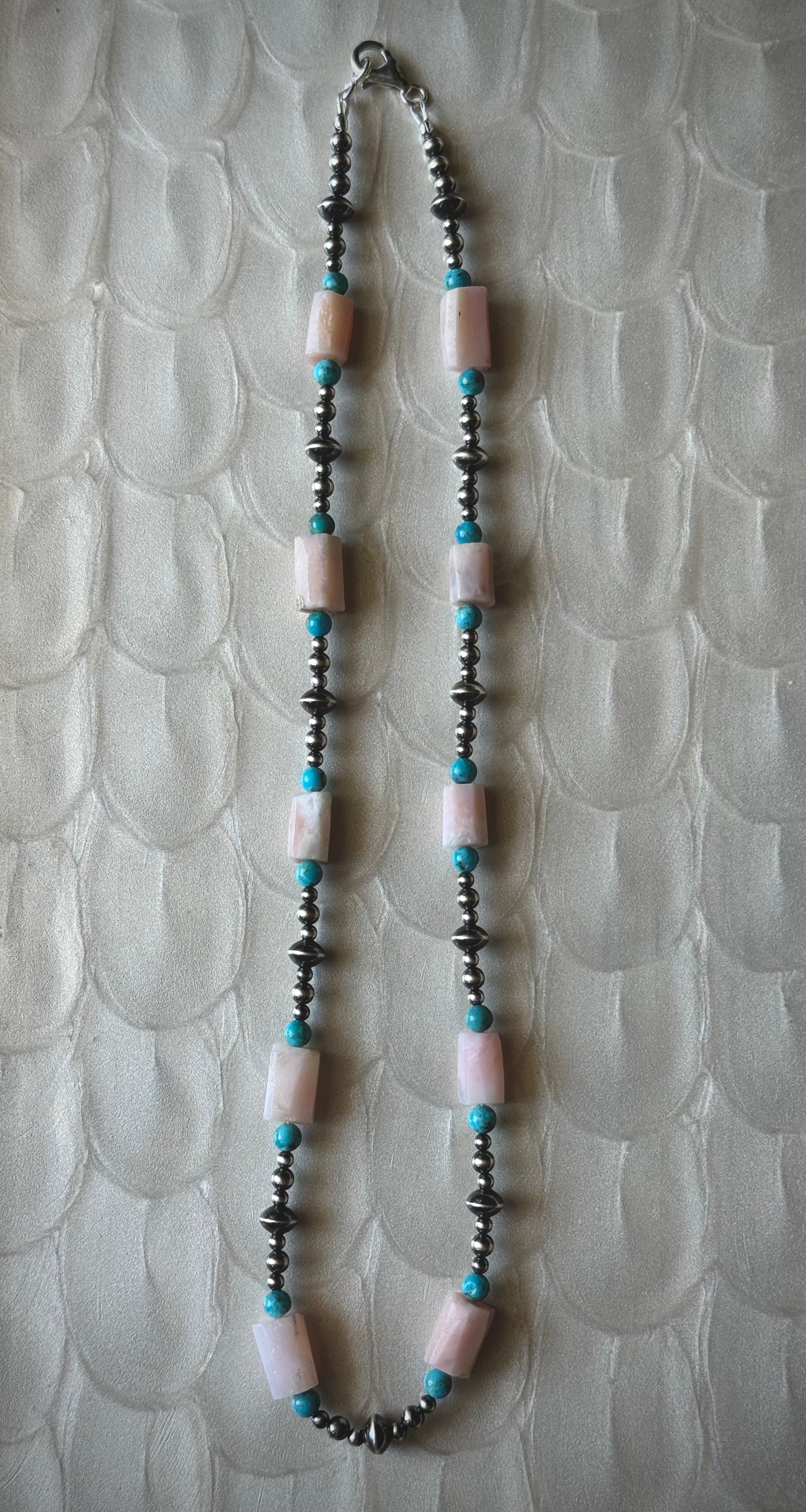 The Wildflower Strand is a celebration of free-spirited beauty, blending soft hues with timeless turquoise. Hand-strung with natural Peruvian pink opal beads and Kingman turquoise rounds beads sized at 4-5mm, this strand carries the effortless feel of a field of wildflowers. Sterling silver saucer beads and sterling silver round beads (ranging from 3-4mm in size) add just the right amount of shine. The Wildflower Strand layers beautifully or stands gracefully on its own. Whether worn with boots and denim or a flowing dress, this strand is designed for the dreamer, the wanderer, and anyone who loves jewelry that feels as natural as it looks.