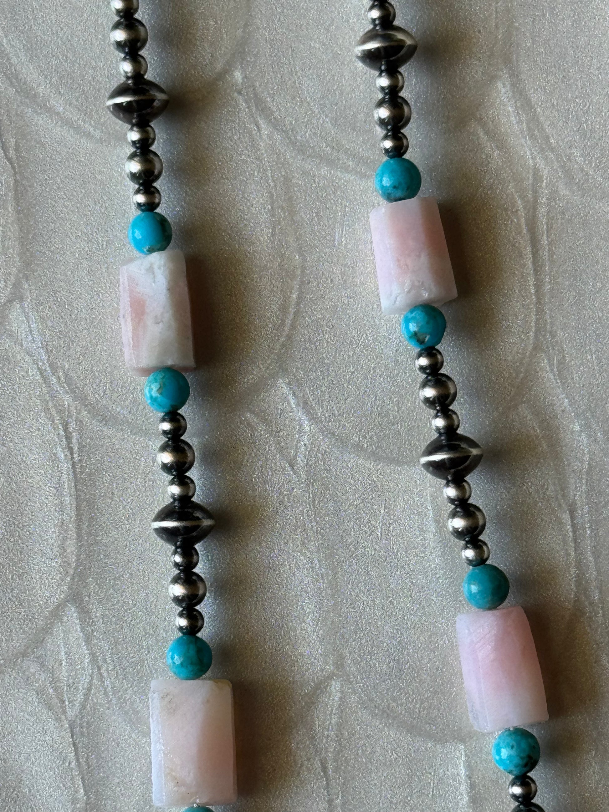 - Features natural Peruvian pink opal beads and genuine Kingman turquoise round beads sourced from the Kingman Turquoise mine in Arizona